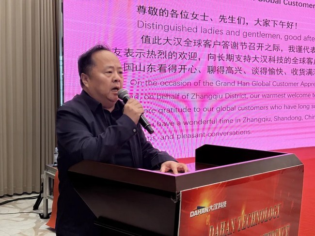 章丘區(qū)貿(mào)促會黨組書記、會長高國慶也蒞臨會場,高書記在會上說大漢科技作為本土標(biāo)桿企業(yè),深耕技術(shù)創(chuàng)新、堅守品質(zhì)承諾,在全球市場中穩(wěn)步前行,其成長離不開全球客戶的信任與支持。當(dāng)前,數(shù)字貿(mào)易、綠色發(fā)展成為全球經(jīng)貿(mào)合作新引擎,貿(mào)促會將持續(xù)提供展會對接、商事服務(wù)、權(quán)益保障等全方位支持,助力大漢科技與各位伙伴深化合作、共拓新局。我們堅信,以誠信為基、以創(chuàng)新為翼,大漢科技必將與全球客戶實現(xiàn)更高水平的互利共贏。