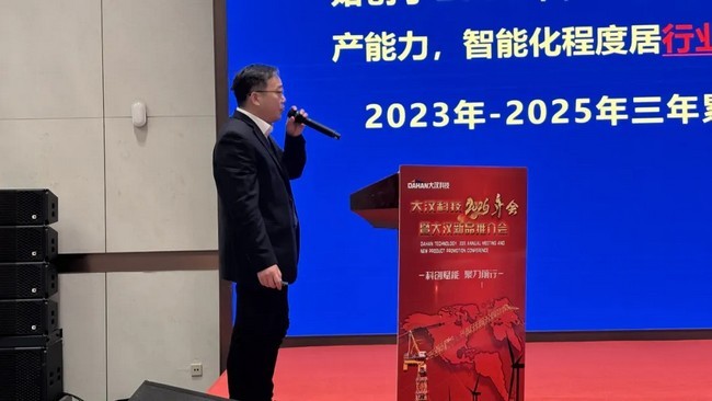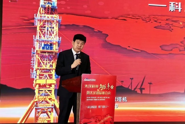 北京富達(dá)建筑設(shè)備租賃有限公司負(fù)責(zé)人張英山作為客戶(hù)代表進(jìn)行發(fā)言。張總回顧了和大漢科技在選擇及定制化塔機(jī)產(chǎn)品方面的合作歷程,他說(shuō)大漢科技近幾年來(lái)聚焦技術(shù)創(chuàng)新,聚焦產(chǎn)品升級(jí),聚焦客戶(hù)價(jià)值,始終強(qiáng)調(diào)科技創(chuàng)新、智能制造對(duì)企業(yè)未來(lái)發(fā)展的重要性。不斷致力于新技術(shù)、新工藝提升,用智能定義工廠(chǎng),用匠心和專(zhuān)業(yè)錘煉精品。推動(dòng)大漢科技向著全面創(chuàng)新、智能升級(jí)的目標(biāo)前進(jìn)。大漢科技此次大會(huì)推出的系列塔機(jī)和施工升降機(jī)產(chǎn)品體現(xiàn)了大漢科技的技術(shù)研發(fā)最高水平和實(shí)力,并祝愿大漢科技在2026年實(shí)現(xiàn)新的突破。