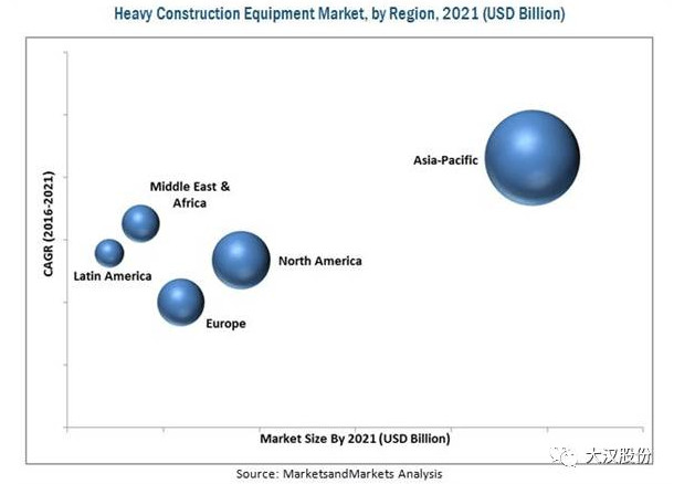 據(jù)MarketsandMarkets預(yù)測,重型建筑設(shè)備市場規(guī)模將從2016年的1291.1億美元增長到2021年的1806.6億美元,估計復(fù)合年增長率為7.0%。預(yù)計重型建筑設(shè)備市場將由于城市化程度提高、基礎(chǔ)設(shè)施和工業(yè)部門的大規(guī)模投資以及新興經(jīng)濟(jì)體的建設(shè)活動增加而高速增長。