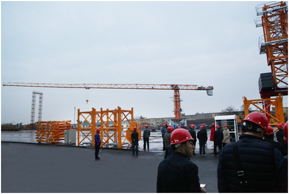全體與會(huì)嘉賓參觀大漢股份專(zhuān)為裝配式建筑研發(fā)的平頭片式7025、7530塔式起重機(jī)(一)