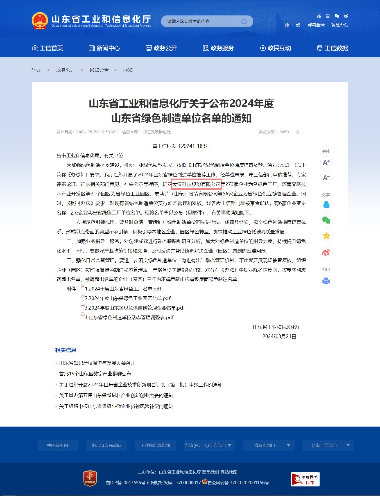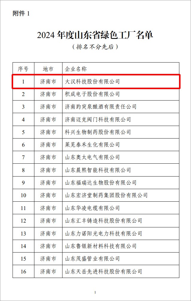 近日,在山東省工業(yè)和信息化廳公布的《2024年度山東省綠色制造單位名單的通知》中確定大漢科技股份有限公司等企業(yè)為省綠色工廠。